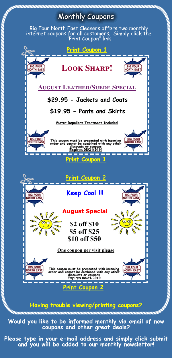 *Big Four North East respects your privacy, your e-mail address, name and address will not be shared. If you would like to unsubscribe simply e-mail webmaster@northeastcleaners.net with the subject Unsubscribe.